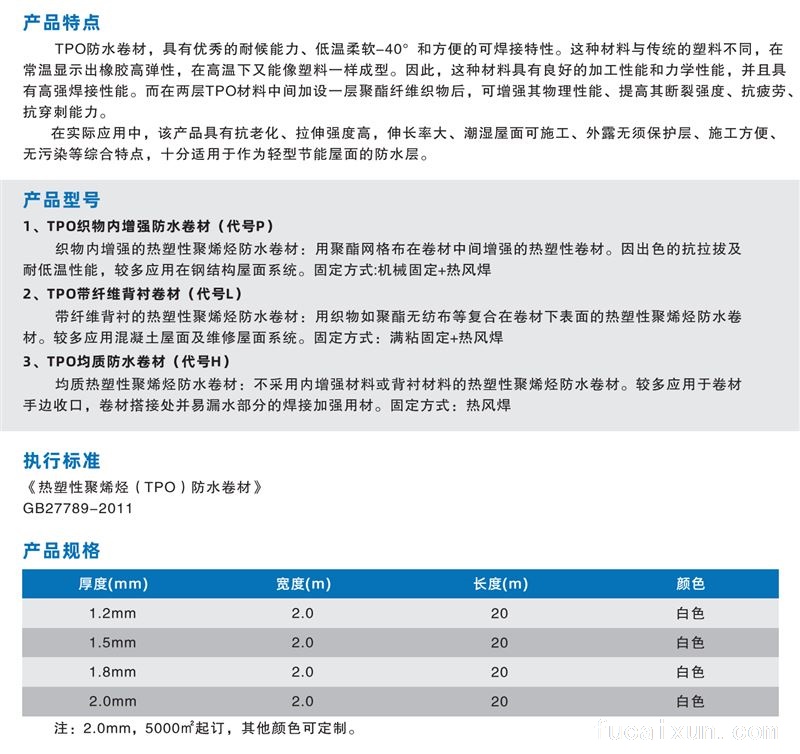 均质热塑性聚烯烃防水卷材:不采用内增强材料或背衬材料的热塑性聚烯烃防水卷材。较多应用于卷材手边收口,卷材搭接处并易漏水部分的焊接加强用材。固定方式:热风焊
