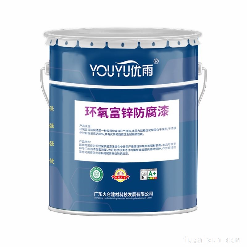 环氧富锌防腐漆是一种双组份富锌环氧底漆,本品为双组份化学固化干燥型,干漆膜中锌粉含量高达 80%,具有优异的防腐蚀及耐磨损性能。